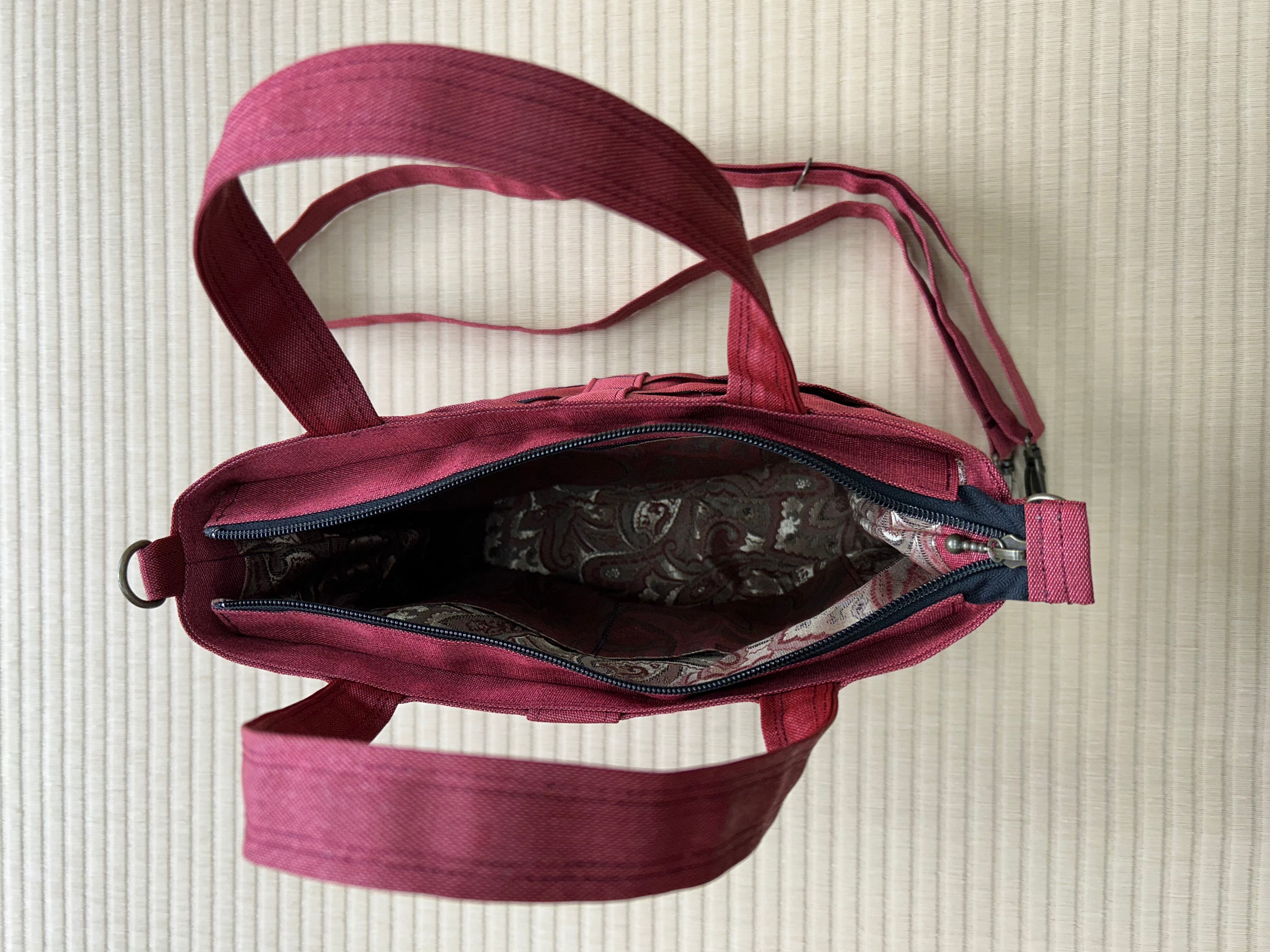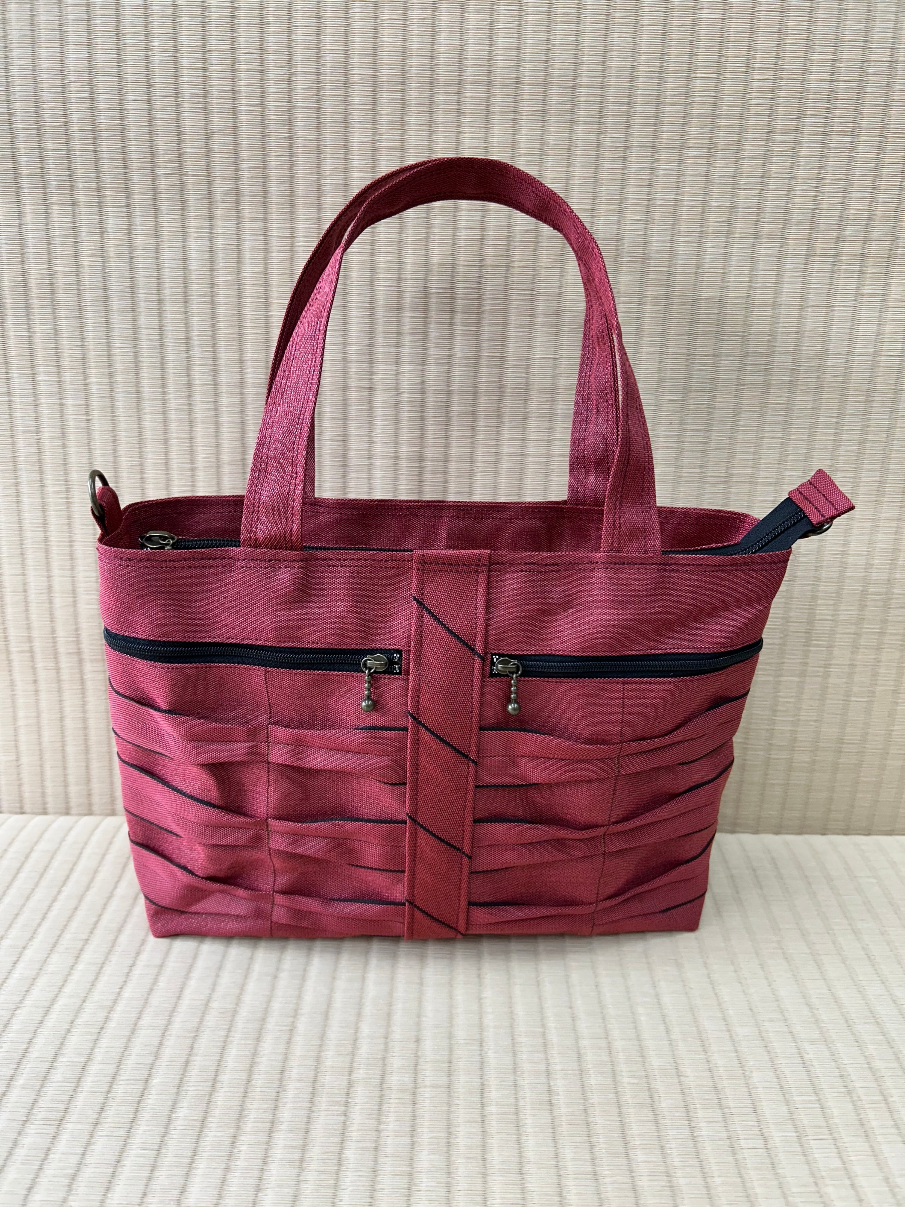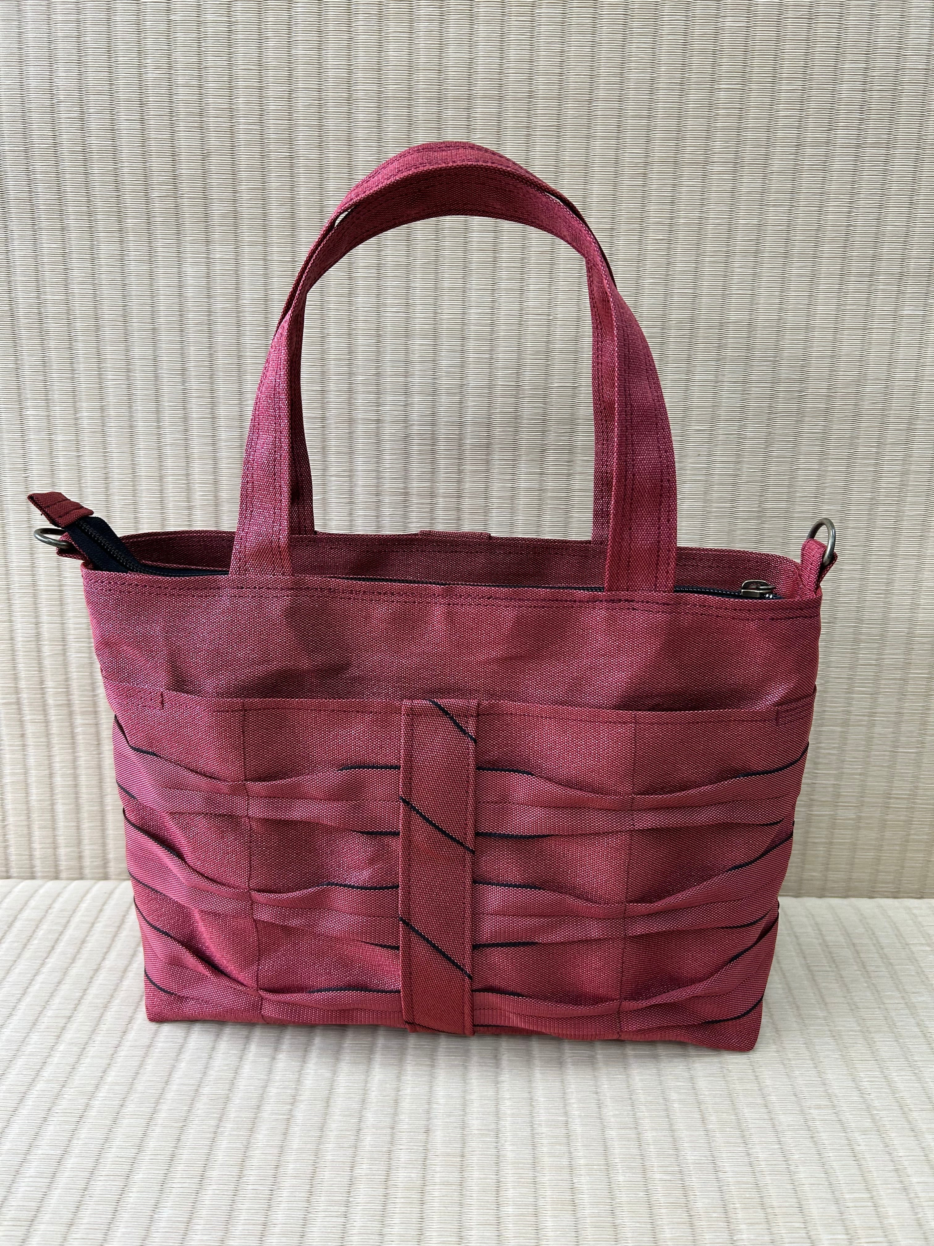 手持ちも肩掛けも両方可能な赤い畳へりバッグ