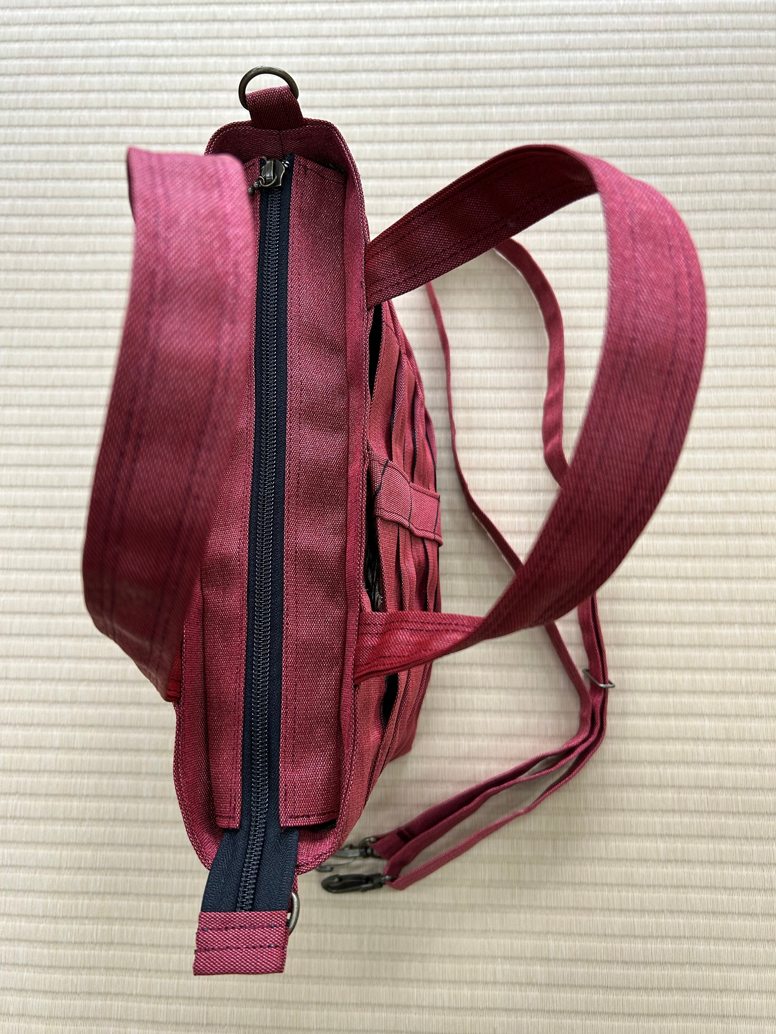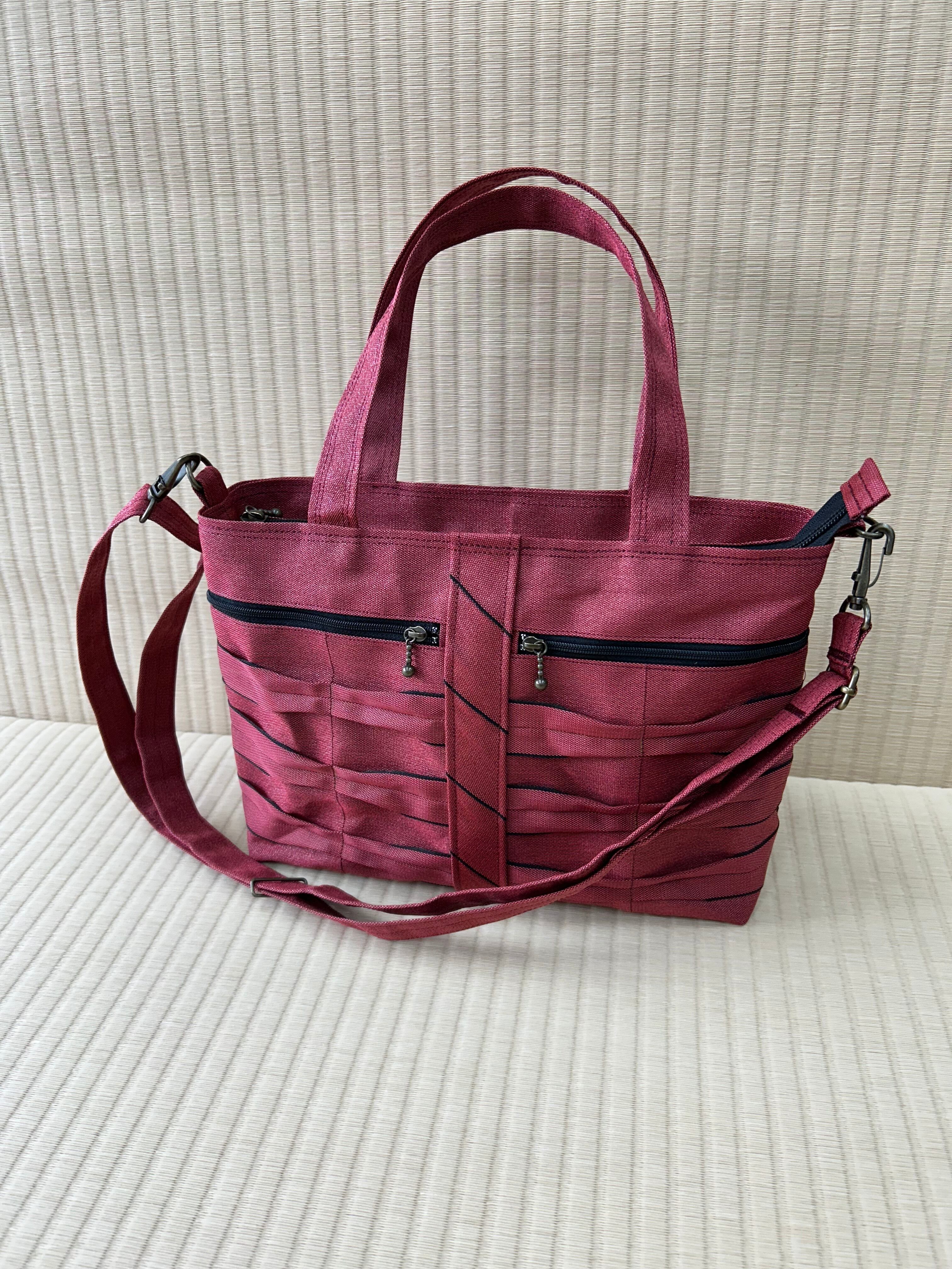 **手持ちも肩掛けも両方可能な赤い畳へりバッグ**